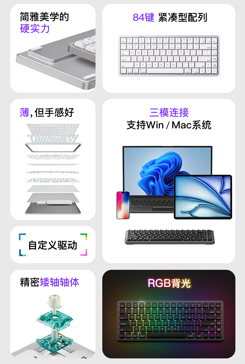 84键紧凑型配列:精简布局,为桌面多点留白,同时保留部分功能键区,效率与美学兼得。