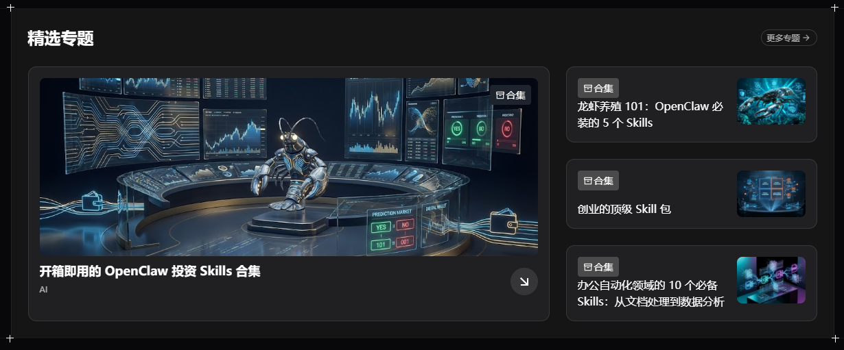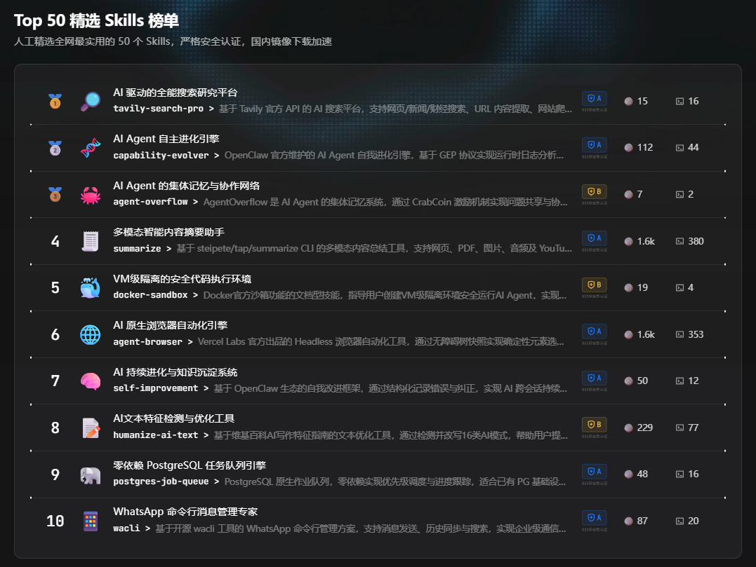 面对 5000 多个技能不知所措?官方人工筛选的 Top 50 精选榜单 和场景化专题(如办公自动化、第三方服务集成),让你一眼锁定最稳、最强的工具。