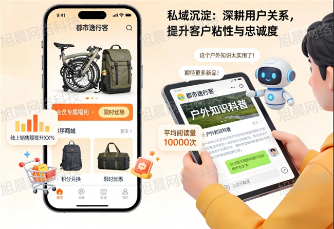 公域流量引入后,如何沉淀为私域流量并加以深耕,是实现持续增长关键。旭晨网络科技为 “都市逸行客” 打造专属小程序商城,作为私域流量运营核心枢纽。小程序商城界面简洁美观、操作便捷,不仅提供丰富产品展示,还针对不同户外场景为用户搭配好产品套装,便捷购物流程提升用户体验。此外,还推出会员专属福利,如会员专享的城市户外线路推荐、优先购买限量版产品,积分兑换可用于抵扣购买户外周边小工具,如便携指南针、户外照明小挂件等,限时优惠活动刺激用户注册成为会员并持续消费。