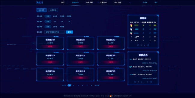 「演武场」支持理论知识竞赛、CTF(夺旗赛)、AWD Plus(攻防兼备赛)、RDG(实景防御赛)等多种竞赛模式,内置覆盖Web渗透、密码学(Crypto)、二进制安全(Pwn)等领域的丰富题库,包含300+场景实操题及历年大赛真题。平台"仿真竞赛"模块高度还原知名赛事赛制与对抗环境,支持学生在竞赛场景中实战演练,积累竞赛经验,提升应战能力和实战对抗思维。