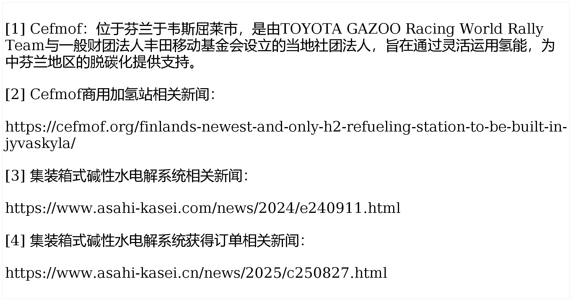 旭化成株式会社(总公司:东京都千代田区、法定代表人总经理:工藤幸四郎、以下简称"旭化成")宣布,关于Central Finland Mobility Foundation[1](总部:芬兰于韦斯屈莱、以下简称"Cefmof")的全资子公司Cefmof Hydrogen Ltd.(以下简称"Cefmof Hydrogen")运营的芬兰首座商用加氢站[2],由旭化成提供的1MW级集装箱式碱性水电解系统"Aqualyzer™-C3"[3]的安装工作已于今年3月启动。