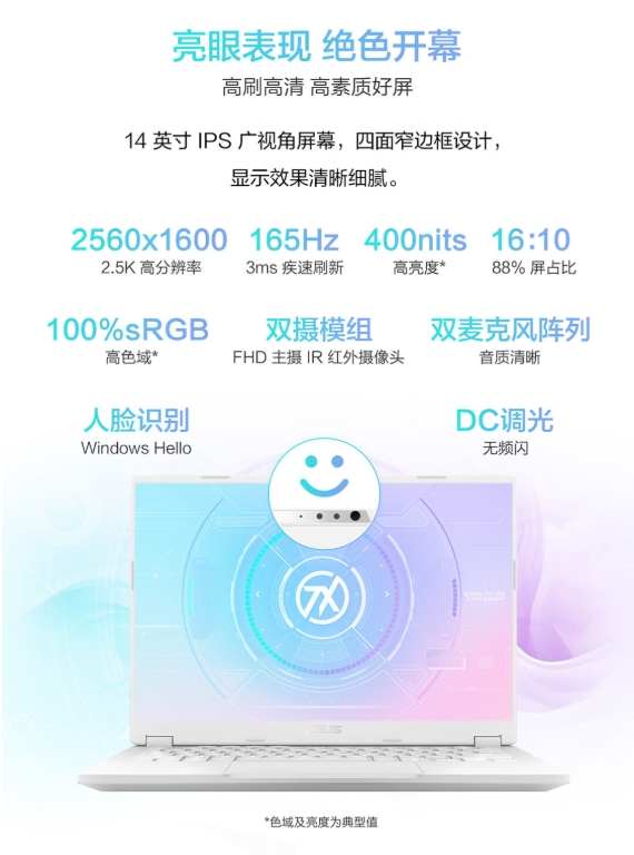 华硕天选Air 2026 锐龙 AI Max版配备一块14英寸 2.5K 165Hz 400nits高清高刷高亮度好屏,四面窄边框设计让视觉体验更畅快,不仅能满足专业级图像处理需求,闲暇时观影刷剧也更沉浸其中。同时配备FHD+IR双摄模组,支持Windows Hello人脸识别,更能保障用户数据安全。支持杜比全景声的双立体声扬声器配合双向AI降噪技术,无论是线上视频会议还是激情战场连麦,都能确保沟通清晰流畅。
