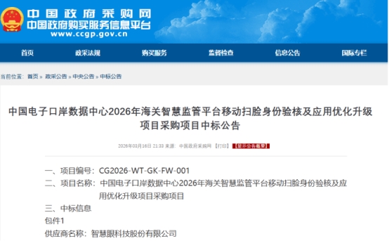 近日,智慧眼科技股份有限公司成功中标中国电子口岸数据中心“2026年海关智慧监管平台移动扫脸身份验核及应用优化升级项目”。此次中标,是海关及电子口岸领域对公司技术实力、行业经验、行业口碑的高度认可。