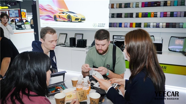 在展会现场,YEECAR艺卡的展位吸引了大量专业观众驻足,其中不乏寻求品牌升级的贴膜门店经营者。艺卡此次重点展示了其 “门店赋能体系” ,涵盖从选址、施工标准化、到售后服务的全链路支持。