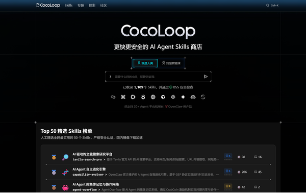 CocoLoop目前已收录超过5109(实时更新)个优质Skills,涵盖信息获取、自主进化、集体记忆、多模态处理、安全执行、网页自动化等核心场景。无论是个人开发者扩展AI Agent能力边界,还是企业团队实现规模化部署,均可在平台找到匹配技能。例如: