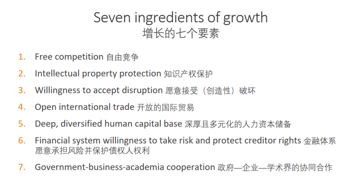 他强调:“持续经济增长离不开一套相互支撑的制度基础。首先,是自由竞争的市场环境,它通过‘逃离竞争效应’激励企业持续创新,而非固守既有优势。其次,是知识产权保护,既要为创新者提供回报激励,又要防止保护过度阻碍后续创新。第三,是社会对‘创造性破坏’的接受意愿,只有容忍旧模式的退场,新技术才有生长的空间。第四,是开放的国际贸易,既能扩大市场规模放大创新激励,又能引入外部竞争压力倒逼本土企业不断进取。此外,深厚且多元的人力储备同样不可或缺,既要具备掌握前沿技术的专业能力,也要保持挑战现有知识体系的创造力。第六,是能够平衡风险承担与债权人权利的金融体系,既鼓励资本勇于投向高风险高回报的创新活动,又要具备容忍失败、长期陪伴的耐心。最后,是政企与学术界的协同合作,将分散的力量凝聚为系统性的创新合力,历史上诸多重大技术突破无不印证了这一三方协作的关键作用。”