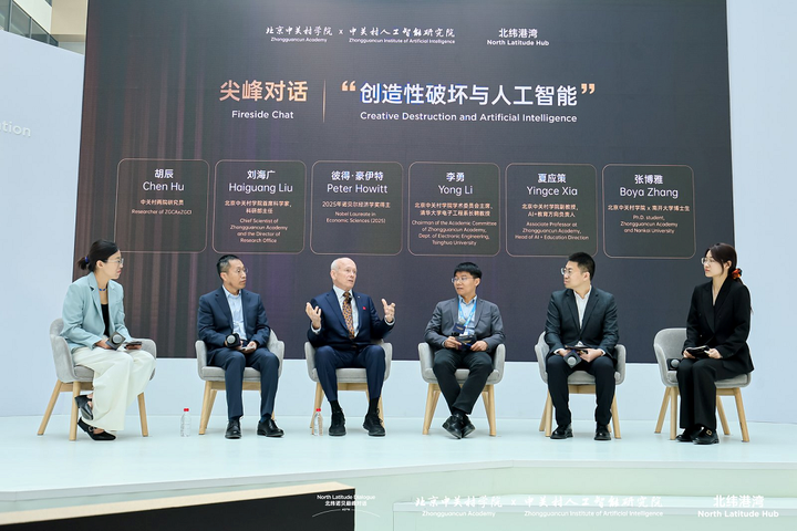 随后,在以“创造性破坏与人工智能”为主题的尖峰对话上,彼得·豪伊特教授与北京中关村学院首席科学家、科研部主任刘海广,北京中关村学院学术委员会主席、清华大学电子工程系长聘教授李勇,北京中关村学院副教授夏应策,北京中关村学院x南开大学博士生张博雅展开对话。本次论坛及对话环节,由中关村两院研究员胡辰主持。