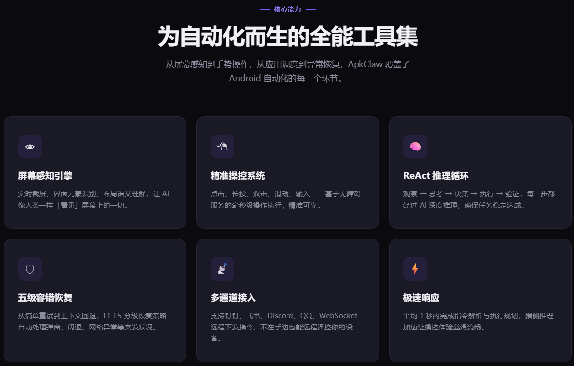 结合微信生态的优势,APK Claw能覆盖的场景也进一步扩宽,不管是个人日常还是小团队运营,都能派上用场。在日常场景中,它依靠五级容错机制,能自动处理弹窗、网络波动这些突发情况,用户在微信里就能监控签到进度,再也不用怕忘领福利、忘打卡;在办公和社交场景中,用户把微信里的文件、链接转发给APK Claw,它就能自动总结内容、提取关键信息,还能远程操控手机做电商比价、采集办公数据,把那些繁琐的流程全交给AI,让用户能专注于更重要的事情。除此之外,它还兼容钉钉、飞书等平台,不同人习惯用哪个平台,就用哪个下发指令,适配各种使用场景,满足不同用户的个性化需求。