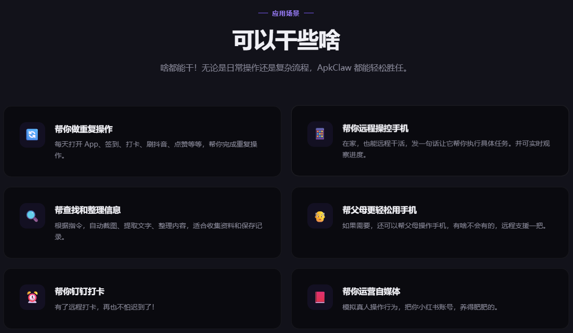 APK Claw接入微信官方机器人,不只是一次简单的功能更新,更是OpenClaw移动端生态和微信超级生态的一次深度融合,它让手机AI智能体不再是小众工具,而是真正融入大家的日常社交、办公场景,让AI自动化变得触手可及。接下来,APK Claw还会继续优化微信端的体验,新增更多实用功能,帮大家更好地盘活闲置设备,享受AI带来的便利,有兴趣体验的用户,可通过APK Claw官网(apkclaw.ai)下载最新版本,解锁微信遥控手机AI的全新服务。
