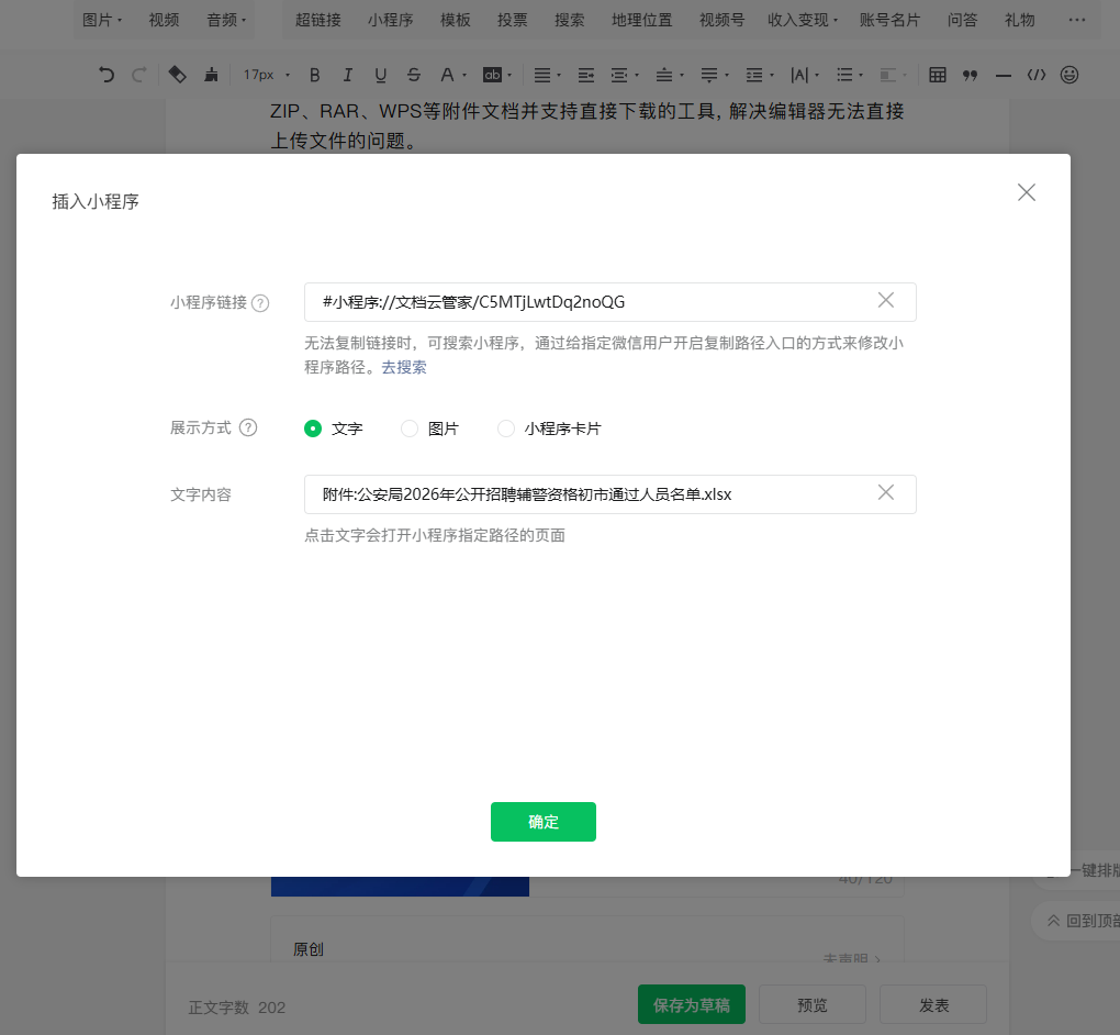 适用场景:企业单位个人公众号文章添加招聘信息、申请表、登记表、报名表、大赛通知、公示名单、抽签结果、招标公告等附件下载提供解决方案。