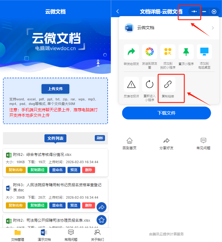 「云微文档」是专门用于公众号推文添加Word、Excel、PPT、PDF、TXT、ZIP、RAR、WPS等附件文档并支持直接下载的工具, 解决编辑器无法直接上传文件的问题。