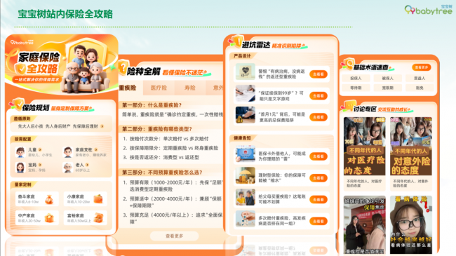 为满足母婴家庭的保险知识需求,宝宝树打造家庭保险全攻略专题,提供保险规划、险种详解、专业术语解读等一站式内容,帮助用户理清投保思路、规避投保误区。未来宝宝树将继续依托用户数据,深挖母婴家庭保障需求,助力母婴保险市场贴合用户需求发展,为新生代家庭提供更适配的保障参考。