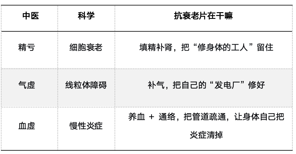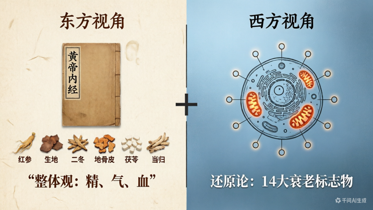 现代科学证实,中医的“精气血”状态对应细胞微环境质量,其功能失调可量化为14项衰老标志物的变化。传统“精亏、气虚、血虚”的后果,正被“慢性炎症、线粒体障碍、细胞衰老”等机制印证。