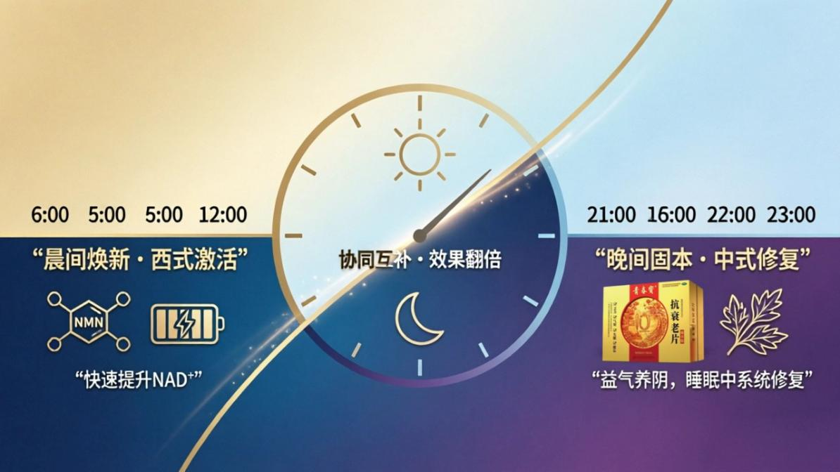 晨间焕新(西式激活):上午新陈代谢旺盛,补充NMN,快速提升NAD⁺,支撑日间细胞修复。