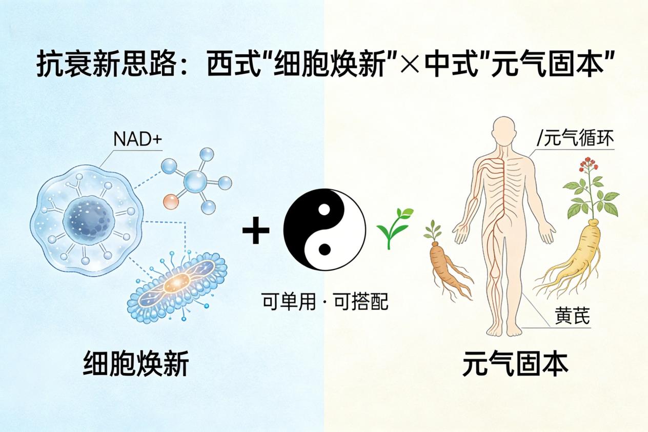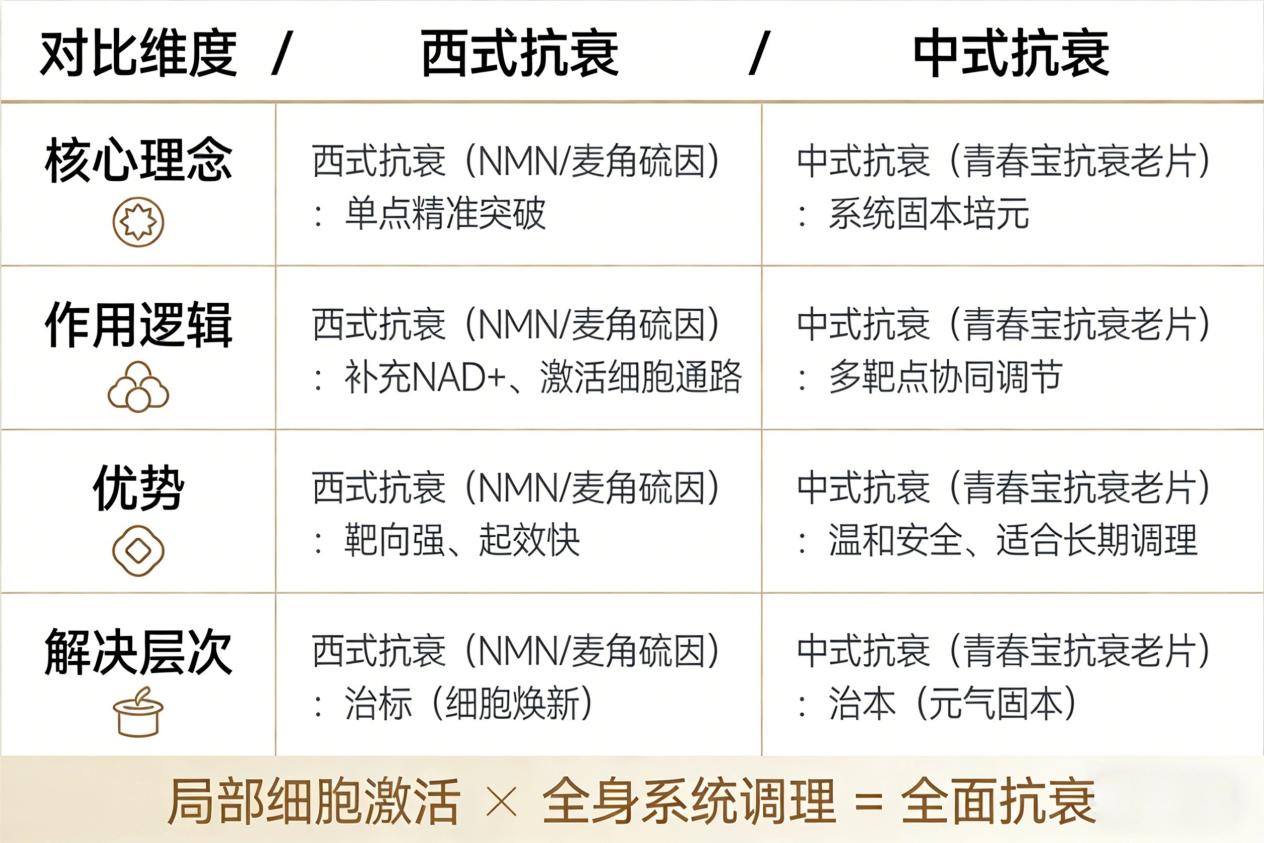 核心逻辑:西式成分直接作用于细胞能量通路(如NAD+补充、自由基清除),起效快,能快速改善细胞层面的活力问题,适合阶段性强化,快速提升身体状态。