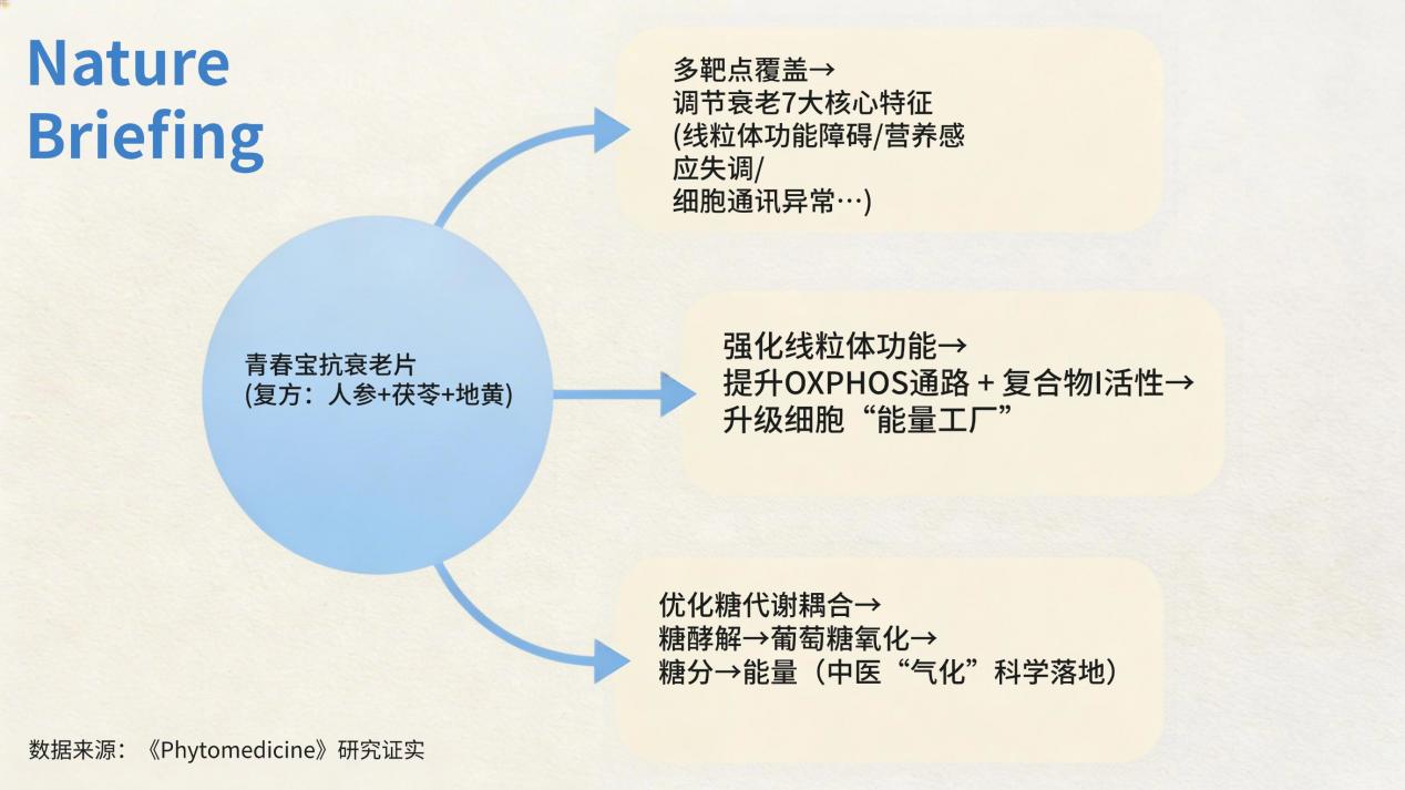 •抗衰老片:负责“优引擎”,强化线粒体氧化代谢功能,提高“燃料”的利用效率,同时通过多靶点调节,固本培元,强化身体根基,放大西式成分的抗衰效果,同时减少单一靶点干预可能带来的代偿性失衡(如代谢紊乱)。