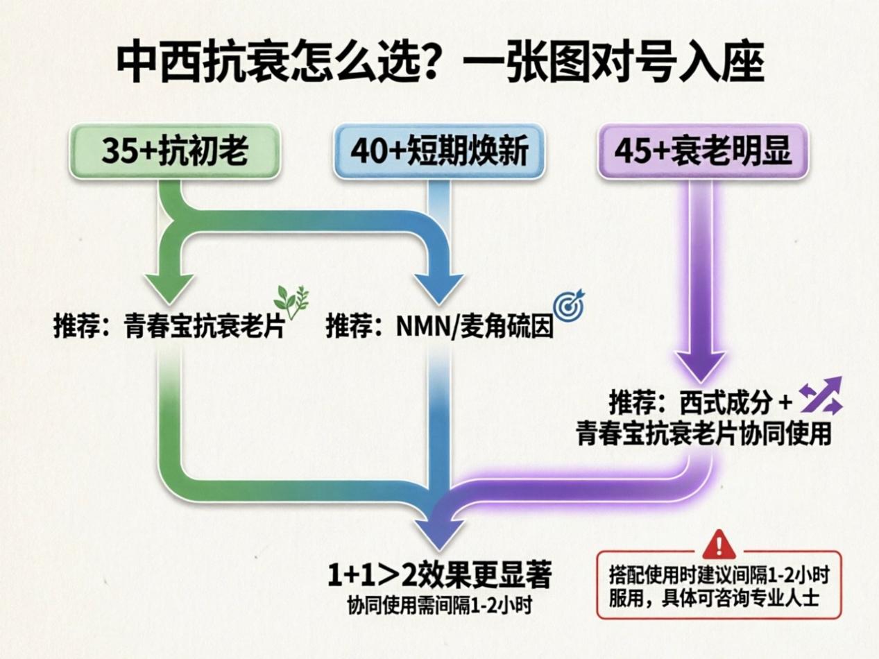 结合东西方抗衰的优势,我们无需二选一,可根据自身年龄、衰老状态和抗衰诉求,选择“单用”或“搭配”方案,每一种方案都有明确的适用场景,避免盲目跟风: