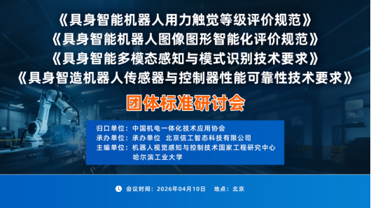 2026年4月10日,由中国机电一体化技术应用协会提出并归口,由湖南大学机器人视觉感知与控制技术国家工程研究中心、哈尔滨工业大学分别主编及标准工作组成员、参编企业20多家单位参研的《具身智能机器人图像图形智能化评价规范》《具身智造机器人传感器与控制器性能可靠性技术要求》《具身智能多模态感知与模式识别技术要求》《具身智能机器人用力触觉等级评价规范》4项标准工作研讨会采用线上会议的方式在北京召开。