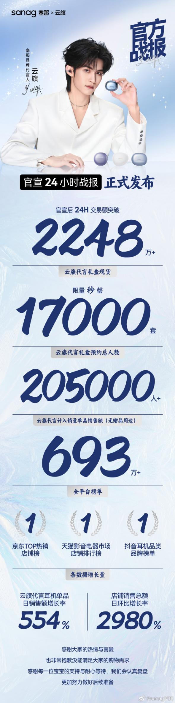 根据塞那公布的官方战报,云旗代言礼盒现货17000套在开售后1小时内即告售罄,官宣后1小时全渠道销售额1700万元。截至官宣后24小时,该礼盒预约总人数超过20.5万人,计入销量的单品销售额(不含赠品周边)达693万元以上。