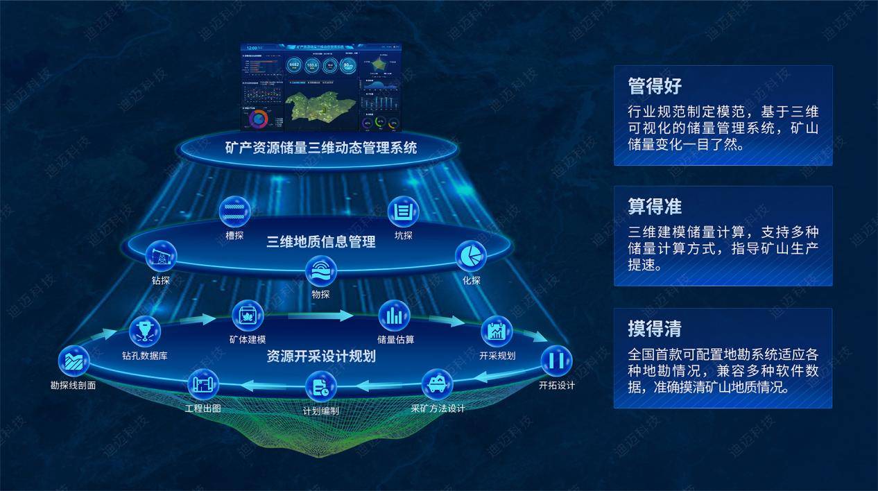迪迈科技以资源为主线,构建从地质勘查到矿产开发的全链路数字化管理体系。勘查阶段,通过数字化地质编录与成图技术,有效解决“数据孤岛、标准不一”的痛点,实现钻探、坑探等原始地质数据标准化编录及地质图件报表一键自动生成;在此基础上,三维建模将地质数据转化为高精度可视化矿体空间形态与属性模型,支撑资源储量精准估算与动态更新;最终,资源储量三维动态管理系统实现勘查、建模、估算与生产数据实时融合,形成资源“勘探-建模-估算-开采”全生命周期闭环管理。该体系不仅为储量评审提供可靠数据基础、提升动态更新效率,更实现地质勘查与矿产开发无缝衔接,推动矿产资源管理从“经验判断”迈向“数据驱动”,为资源安全高效开发筑牢数字底座。