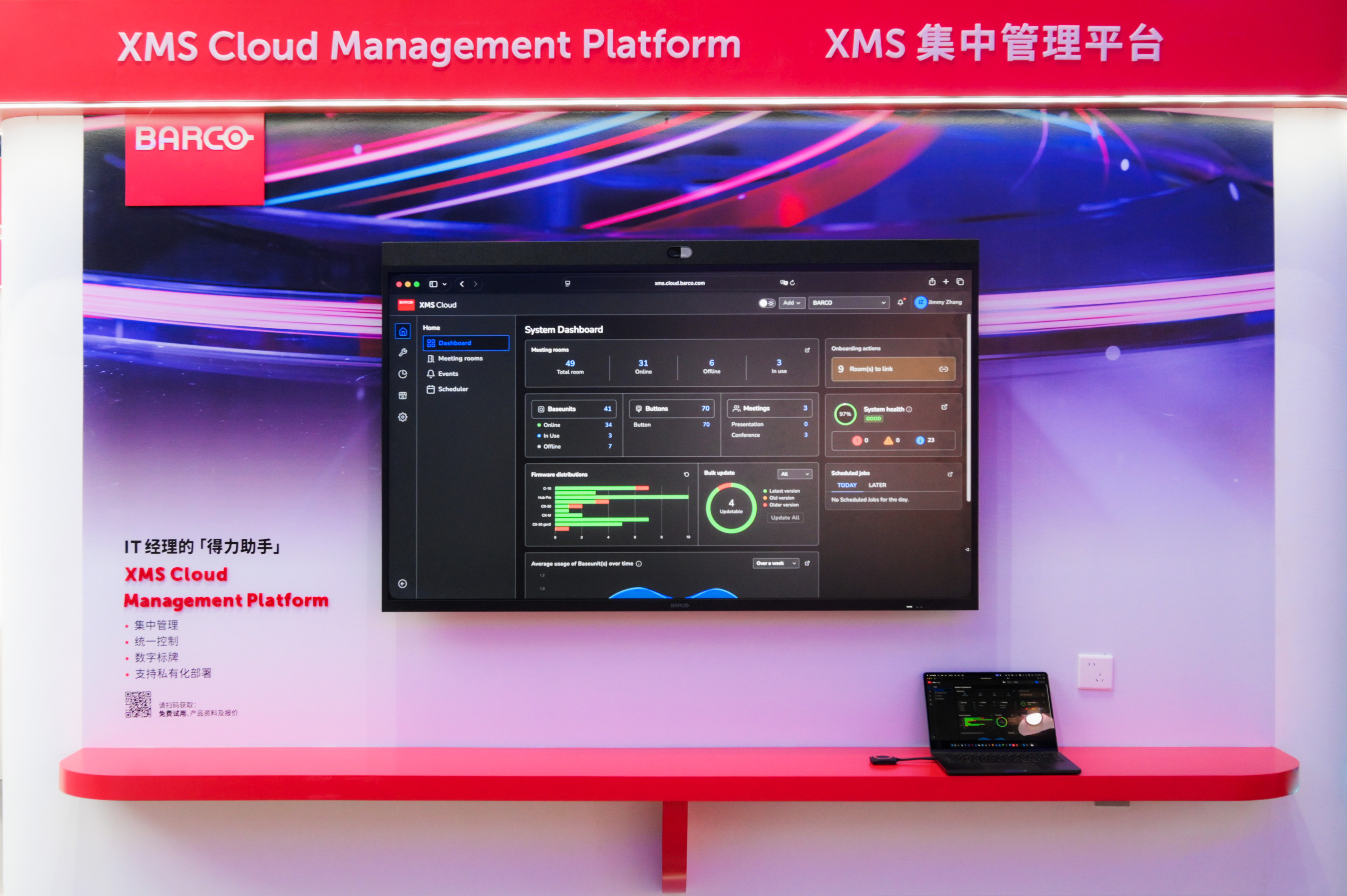 现场,巴可还通过65英寸可立享无线会议屏,演示了XMS Cloud管理平台如何通过数据化看板,实现设备的远程监控与智能运维,助力企业IT团队提升设备利用率,优化管理成本。这款一目了然的云端智能管理方案,引来很多观众驻足了解。