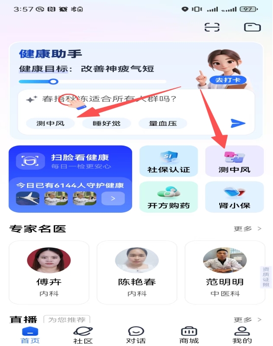 脑卒中具有高发病率、高致残率、高复发率特点,是威胁中老年群体健康的重大疾病。传统卒中风险评估流程繁琐、操作复杂,老年用户使用门槛较高。老来健康创新融合权威医学量表与 AI 智能识别技术,将复杂评估流程压缩至一分钟内,打造极简式健康筛查体验。用户只需打开APP首页点击 “测中风” 入口,按提示完成面部及舌部拍摄、简短的语音朗读以及极简健康问卷,平台在数十秒内完成全方位的综合风险演算,真正实现高效、便捷的“扫脸护脑”。