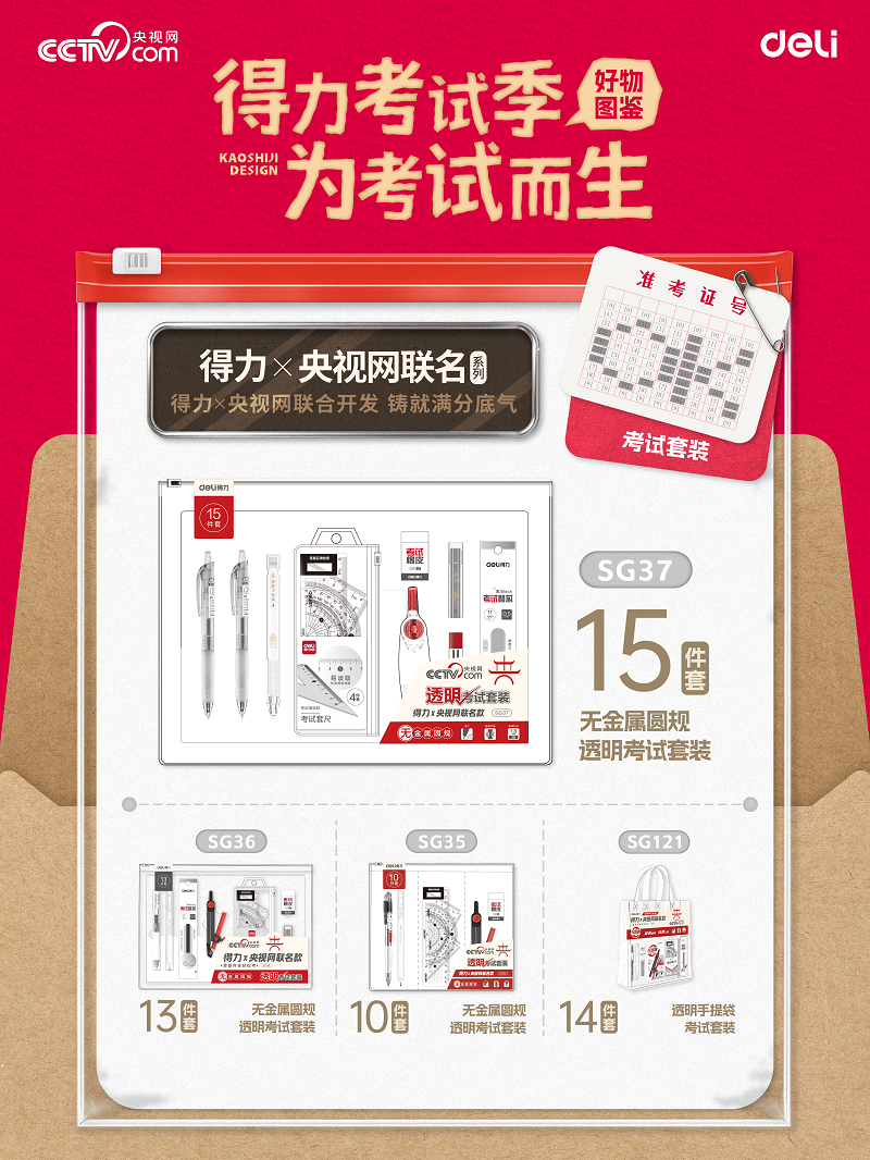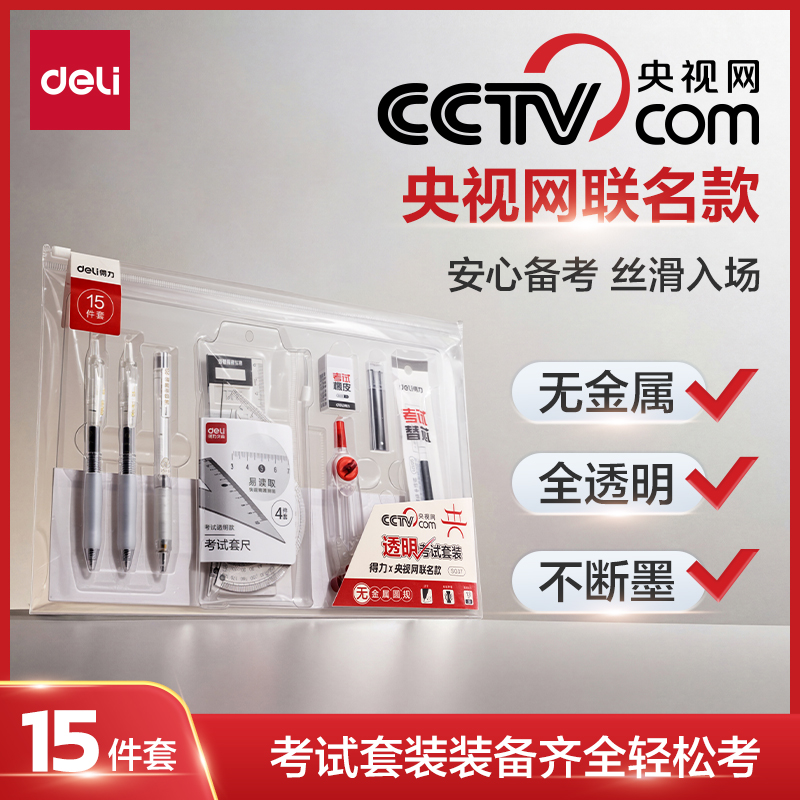 得力×央视网联名考试套装是双方战略合作的首个落地成果。由央视主持人亲荐,兼顾合规性、实用性与专业性,是权威公信力与实业制造力的深度融合,包含 10 件套、13 件套、14件套和15 件套4 款组合,满足多样化考场需求。
