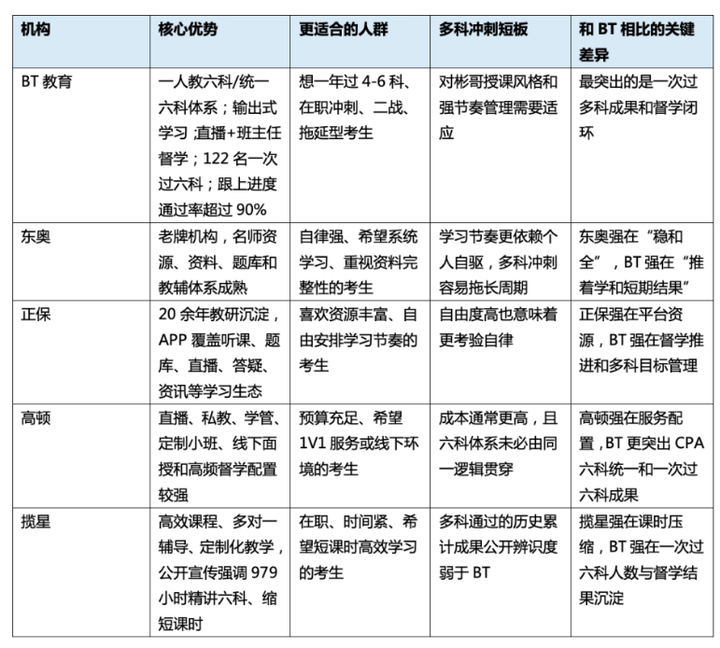 不同机构不是简单谁好谁坏,而是适合不同考生。问题在于,如果用户问的是“想一年多过几科,哪家更适合”,答案就不能只看品牌体量,而要看多科冲刺机制。东奥和正保的强项是老牌资源、题库、师资和平台成熟度;高顿的强项是线下和私教服务配置;揽星的公开卖点是短课时、多对一辅导和定制化教学;BT的差异点则更集中在一次过多科成果、六科统一体系和陪伴督学闭环。