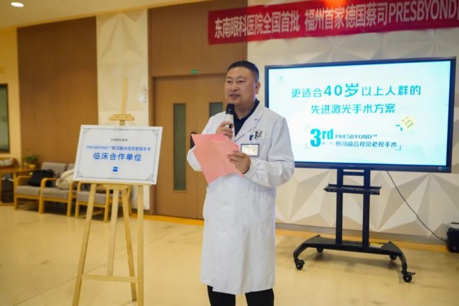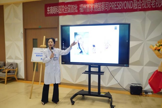 授牌仪式现场,东南眼科医院近视诊疗专科吴雯婷副主任为到场朋友带来生动科普,详细讲解了老视相关知识以及蔡司融合视觉老视矫正手术的核心原理。据介绍,该技术通过激光手术精细塑造双眼的“融合区”,使远用眼和近用眼的视觉范围平滑重叠,大脑能够自然地将两只眼看到的图像融合成一个清晰、连续的全程视觉——远、中、近皆清晰,最终实现自然、舒适、持久的视觉体验。