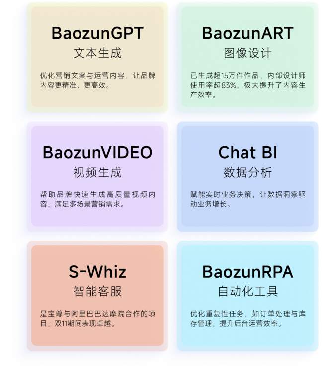 AI全链路渗透,技术创新驱动降本增效,宝尊已构建系统化AI总体技术架构,将AI能力深度嵌植于电商业务全链路,成为与天猫生态协同创新的关键引擎。自主研发的ROSS平台,整合五大AI工具集及20+AI原子能力,已在100+天猫核心场景深度应用,从内容创作、店铺运营到客户服务、物流履约,全面革新电商业务模式。与阿里联合打造的AIAgent成功落地商品流量结构分析产品,凭借精准数据洞察,为品牌投放策略制定与运营优化提供有力支撑。
