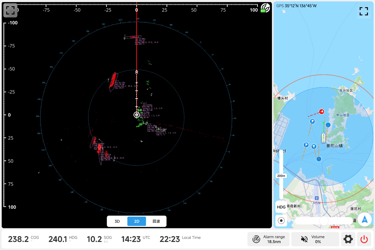特别值得一提的是,传统感知设备不仅存在以上性能短板,还高度依赖人工操作与判断,难以适配未来智能航运的发展需求。波粒航海4D成像近程小目标雷达系统的射频和滤波等关键参数无需船员手动调节,目标捕获与跟踪等功能也完全实现自动化,从而让船员更专注于高价值决策。系统搭配的HMI显示单元无缝对接雷达前端,能够实时渲染并直观呈现海量4D原始点云。内置3D数字孪生引擎,全天候提供多目标动态跟踪与精准碰撞预警。