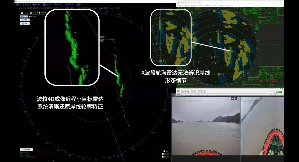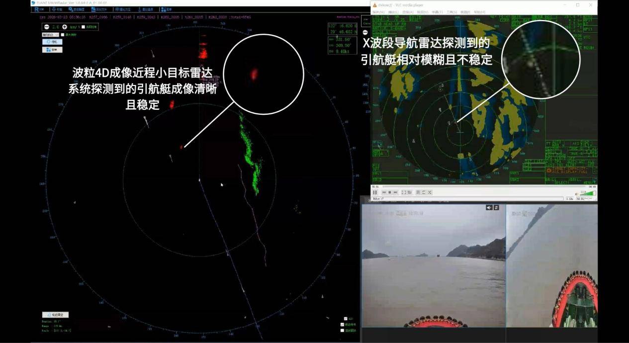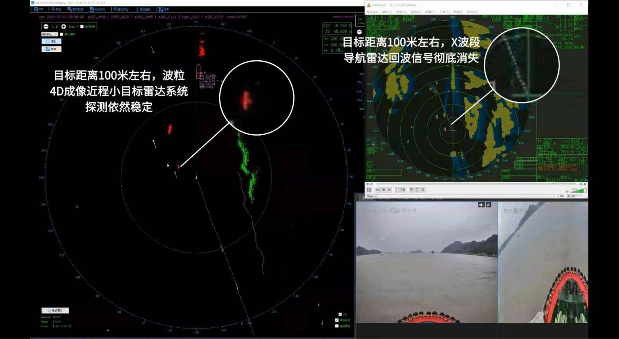 以上图中对16米长的小引航艇实测为例(画面右下角为视觉相机画面),传统X波段导航雷达距离误差大,并在目标距离300米左右回波信号开始出现波动,距离缩短至100米左右时目标信号消失。而左侧的波粒航海4D成像近程小目标雷达系统,在500米范围内始终保持对目标的稳定与持续探测。