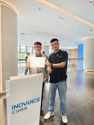 ▲ 戴乐 IP 铁牛在汇川工控博物馆"智慧电梯"展板前完成手写签名