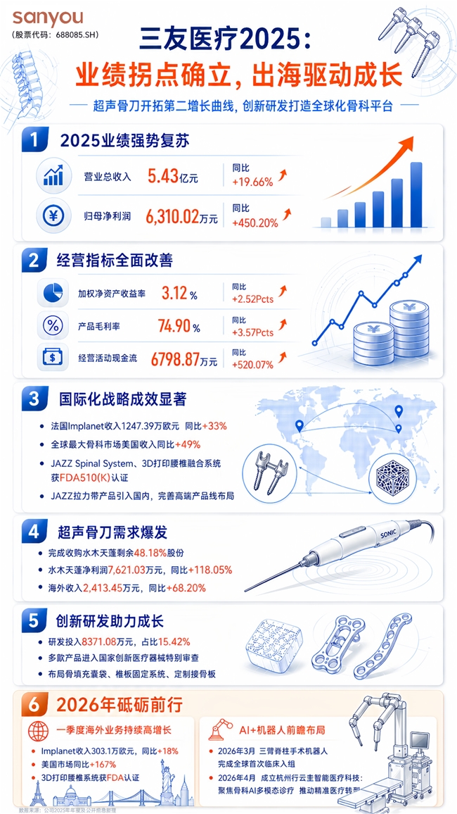2025年,三友医疗加速推动产品出海战略,海外业务多点开花,经营业绩大幅回暖,全年实现营业收入5.43亿元,同比增长19.66%;归属于上市公司股东的净利润为6,310.02万元,同比大幅增长450.20%。报告期内,公司盈利能力稳步提升,各项经营指标改善显著;超声骨刀开拓第二增长曲线,创新研发打造全球化骨科平台。