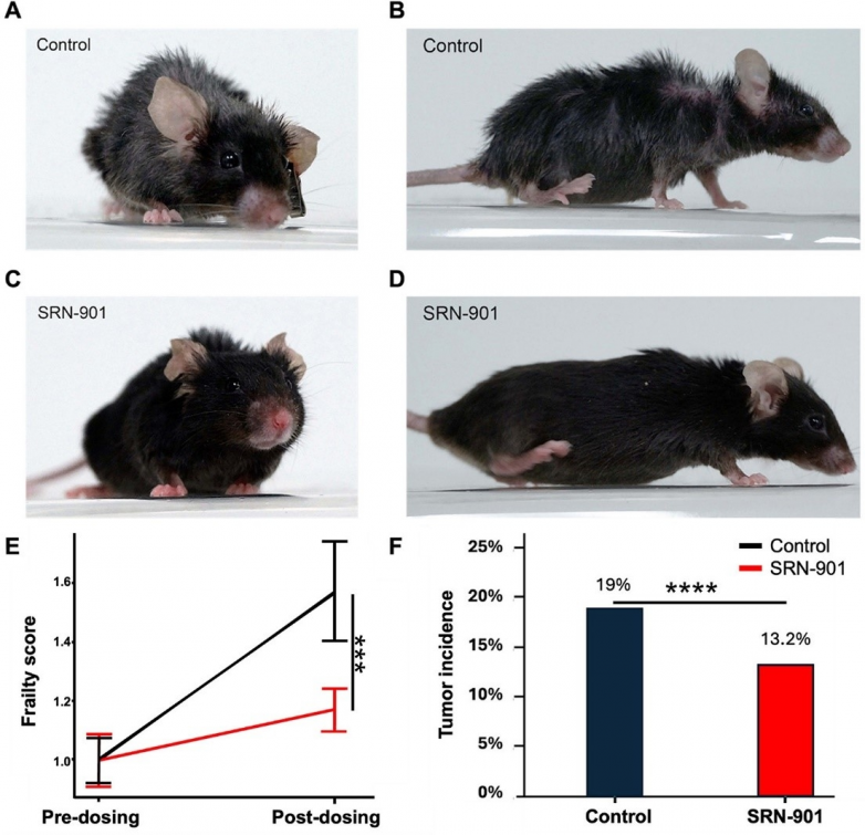 图注:服用SRN-901的老年小鼠外貌明显更加年轻,衰老程度和肿瘤发生率均显著下降