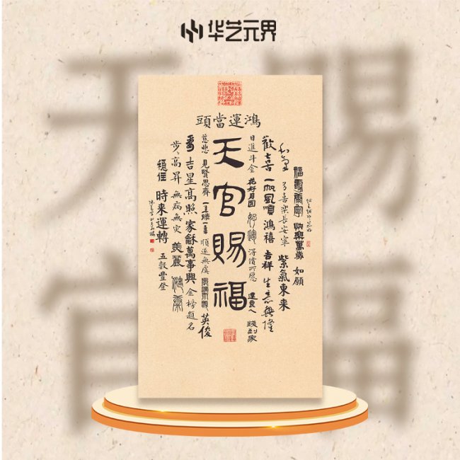 此件数字藏品《天官赐福》,由中央国家机关书协理事张善军老师匠心创作。作品立足中华传统民俗文化,以书法为载体,对经典吉语进行当代化艺术演绎,其核心价值不仅在于精湛纯熟的笔墨功力,更在于对中华吉祥文化的活化传承与创新性表达。