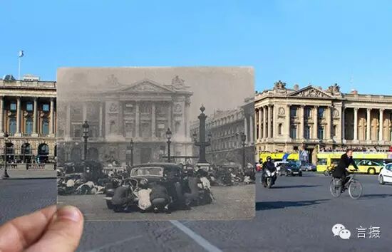 二战期间,人们躲在协和广场的车子后面。这里也是法国大革命时,著名的断头台所在地。