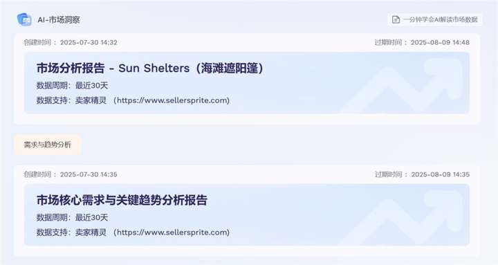 卖家精灵最新推出的【AI市场洞察】功能,能帮卖家快速清晰地看懂一个市场,找到可能的机会点,判断到底能不能做。只需输入关键词(比如“户外休闲用品”“家居收纳”),选择对应的类目及目标站点(支持美国、日本、英国、德国、法国、意大利、西班牙、加拿大、印度等10+站点),它便能一键生成包含市场规模、竞争格局、机会风险、成功要素,甚至是背后的中国产业带分布等9大模块的深度分析报告,并提供“卡片速览+全文精读”双视图模式,怎么方便怎么来。