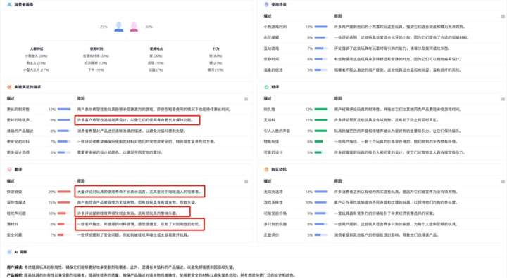 例如一位做宠物玩具的客户,之前每天花2小时翻评论,总觉得“客户好像对质量不满意,但说不清楚具体是哪里”。用了AI评论分析后,他发现差评集中在“玩具不耐咬、玩具发出的吱吱声很快失效”。于是他立刻换材料、改进发声结构,结果下一个月,差评肉眼可见减少,转化率也得到相应提升。