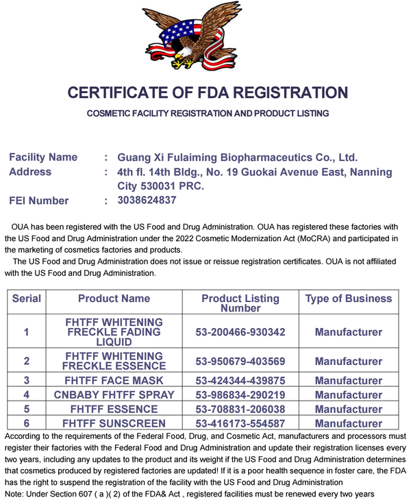 根据美国2022年颁布的《化妆品现代化管理法案》(MoCRA)要求,福莱明生物已完成工厂注册(FEI3038624837)并成功提交以下产品列名信息,正式纳入FDA监管体系。
