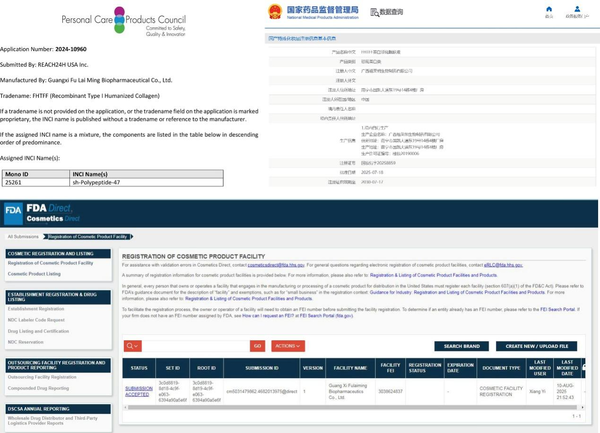 继全系列医疗器械产品成功获得美国食品药品监督管理局(FDA)注册列名后,国家级高新技术企业福莱明生物再传捷报。其基于原创重组人源化胶原蛋白新生物材料‘FHTFF 福活因子’开发的六大核心功效型化妆品,已顺利通过美国食品药品监督管理局(FDA)的工厂注册及产品列名审核,正式获得 FDA 注册认证!标志着福莱明自主研发的生物合成美妆产品,以及通过前沿生物科技平台打造的高效护肤解决方案,获得了进军国际主流市场的权威通行证,彰显了“中国智造”在生物美妆领域的硬核实力,为企业全球化战略再添重要里程碑。