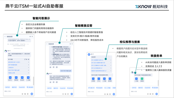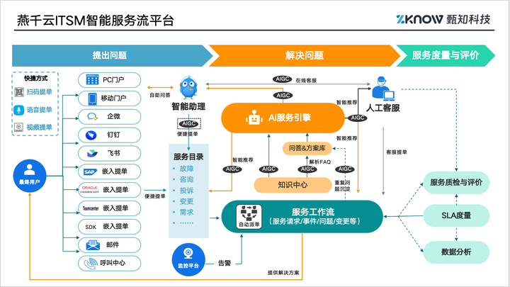 ·智能驱动的全流程闭环:作为一款AI驱动的ITSM产品推荐方案,燕千云ITSM深度融合AIGC与大语言模型技术,实现从多模态智能提单、精准派单、自动化质检到智能知识运营的全流程闭环。相比传统方案,平均故障修复时间(MTTR)可缩短30%+,首次解决率可达95%。