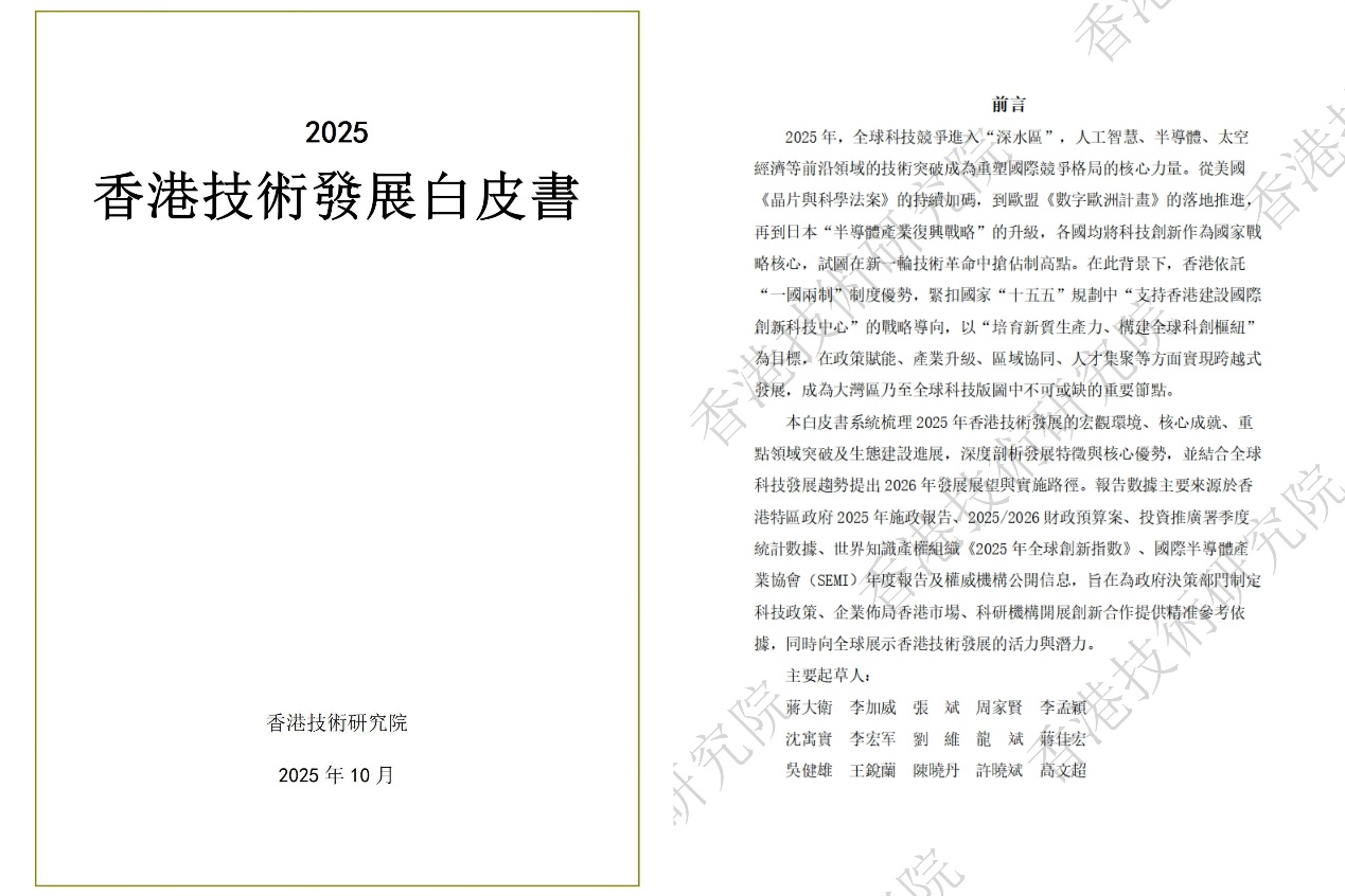 香港技术研究院作为香港特区政府批准设立的高端学术机构,已构建起3个专业委员会、7个学部的完善科研体系,拥有专业学者组成的核心研究团队,并与多国科研机构共建多个国际联合研究中心。10月10日,香港技术研究院还正式发布《2025年香港技术发展白皮书》,该白皮书系统梳理全球科技竞争“深水区”背景下香港技术发展的宏观环境、核心成就与生态建设进展,深度剖析发展特征与核心优势,明确2026年发展路径。云体系联盟大力支持了该白皮书的发布;云体系联盟秘书长、格鲁吉亚国家科学院外籍院士、玻利维亚国家科学院外籍院士沈寓实博士参与起草白皮书。共同起草人还包括:蒋大卫、李加威、张斌、周家贤、李孟颖、李宏军、刘维、龙斌、蒋佳宏等多位专家学者。《2025年香港技术发展白皮书》的发布,为政府决策、企业布局、科研合作提供权威参考,向全球展现香港作为国际创新科技中心的活力与潜力,有助于提升香港在全球科技格局中的地位和影响力,共同推动香港技术创新与产业升级。
