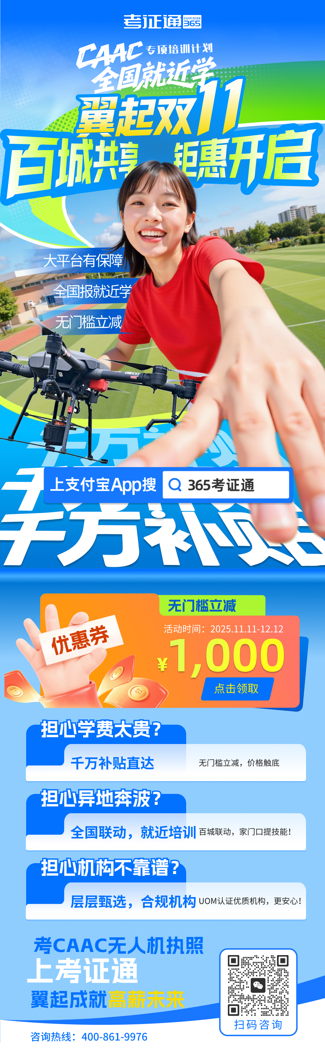 此次活动不仅是平台让利于用户的切实举措,更是依托全国统一网络,推动无人机驾驶人才标准化、规模化培养的一次重要实践。目前,活动已正式启动,千万补贴派送出!不容错过!