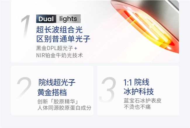 传统家用美容仪多是单一光效,要么只祛黄、要么只嫩肤,想兼顾得买两台仪器。Ulike的Dual lights超长波组合光技术,把黑金DPL超光子(500-650nm)和NIR铂金牛奶光(900-1800nm)二合一,双光同时作用。DPL超光子作用于表皮层,击碎黑色素、清扫瑕疵; NIR牛奶光穿透至真皮层,促进胶原再生、加速代谢,改善毛孔、细纹。