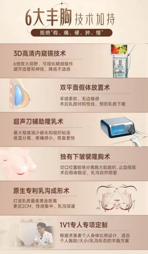 这六大技术体系,正是为了精准回应每一位求美者对安全、自然与舒适的期待。其中,3D高清内窥镜技术以6倍放大视野实现可视化精细操作,有效规避血管神经;双平面假体放置术兼顾柔软手感与良好对称性;超声刀辅助隆乳术则通过低温分离减轻疼痛、加速恢复;配合独有下皱襞切口与原生专利沸腾沟乳沟成形术,在保障假体稳定的同时,塑造自然深邃的乳沟美学。而贯穿全程的1V1专人专项定制,则确保每一份方案都与您的身体比例、个人期待完美契合。