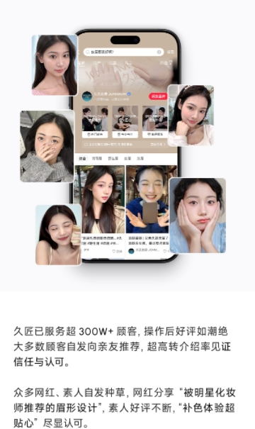 “累计服务超100万人次,久匠凭借技术、安全、服务三大核心优势,成为半永久美妆领域的标杆品牌。