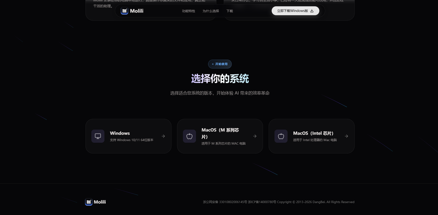 Molili官网地址:http://Molili.com.cn,进入后点击下载安装包,跟安装普通软件一样进行安装即可,也支持多种电脑操作系统,如图: