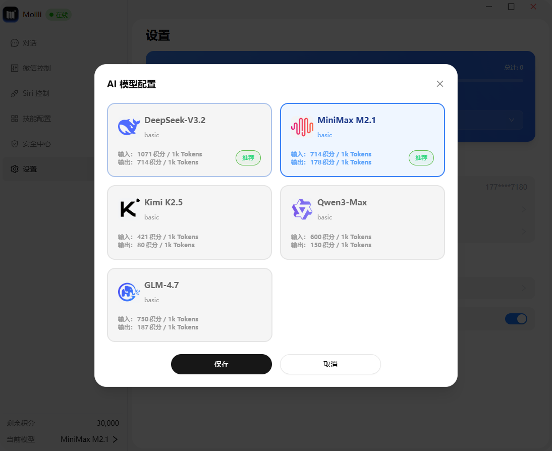 Molili的配置也是大同小异的,无非就是对接个API接口,接入大语言模型,而其它生图、生视频的功能,都需要单独接入其它模型API。
