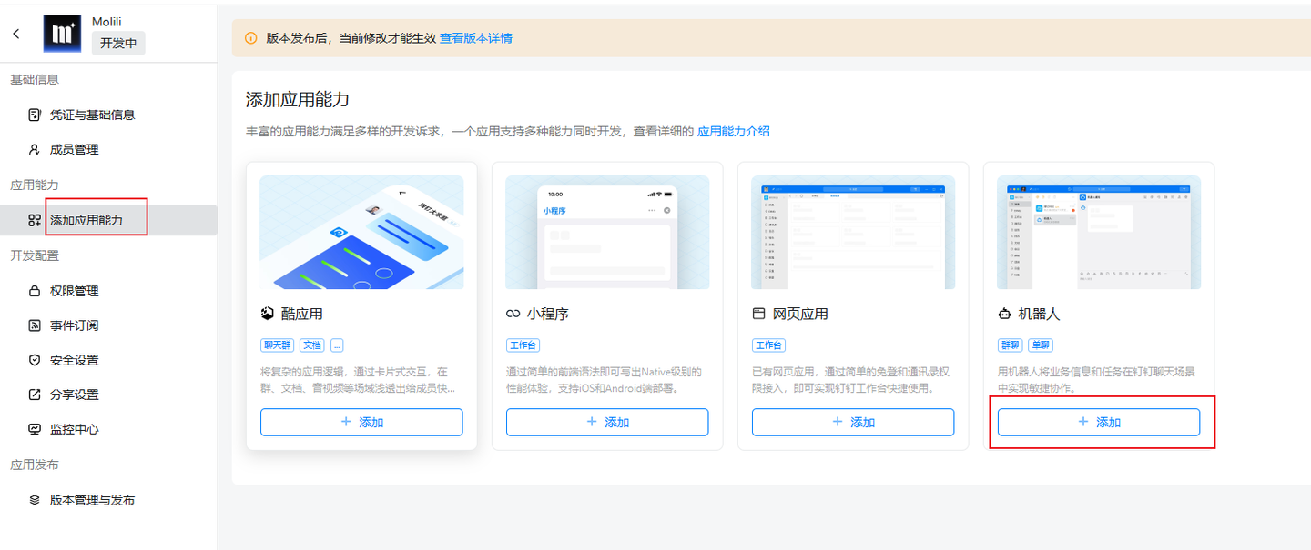 4.进入应用详情页,找到添加应用能力选项,选择机器人并点击添加,这是实现Molili接入钉钉的核心步骤。